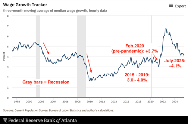 At +3.9% y/y, wages are still rising faster than prices, meaning real purchasing power for workers continues to expand. While that’s welcome news for households, it complicates the Fed’s mission to tame inflation sustainably. As Chair Jerome Powell has said repeatedly, the sweet spot for wage growth consistent with 2% inflation is 3.0–3.5%.